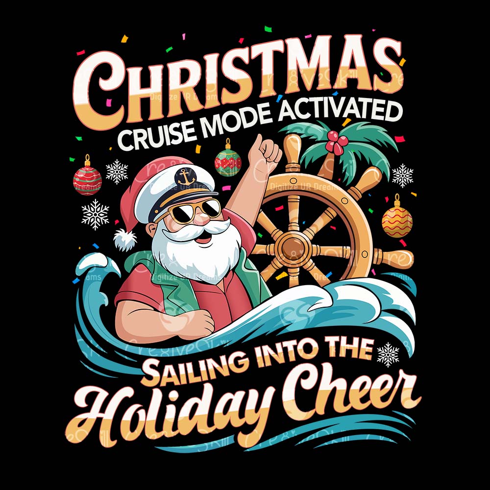 This Christmas Cruise Santa vector design brings a bright and cheerful holiday feel with a fun nautical twist. The artwork features Santa dressed in a relaxed cruise outfit, complete with sunglasses, a sailor hat, and a confident pose at the ship wheel. Waves, ornaments, snowflakes, and a tropical palm add a playful mix of winter and beach elements, creating a lively festive mood. The blend of bold colors and smooth lines makes the design stand out on apparel, accessories, and holiday merchandise. Ideal for T shirts, hoodies, mugs, tote bags, posters, and digital products, this design is perfect for cruise lovers, beach fans, and anyone who enjoys a lighthearted holiday theme.